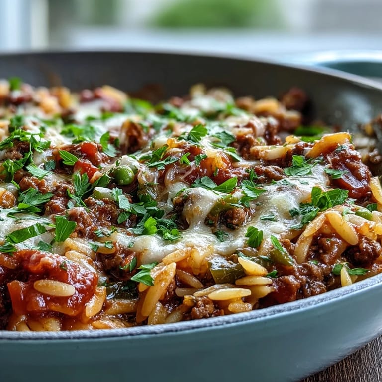 Save to Pinterest My neighbor knocked on my door one Thursday evening with a bag of bell peppers from her garden and a shrug that said, "I have too many." I had ground beef thawing and a box of orzo I'd been meaning to use for weeks. Within an hour, my kitchen smelled like garlic and tomatoes, and I had a skillet full of something that tasted like comfort itself. That improvised dinner became a weekly ritual.