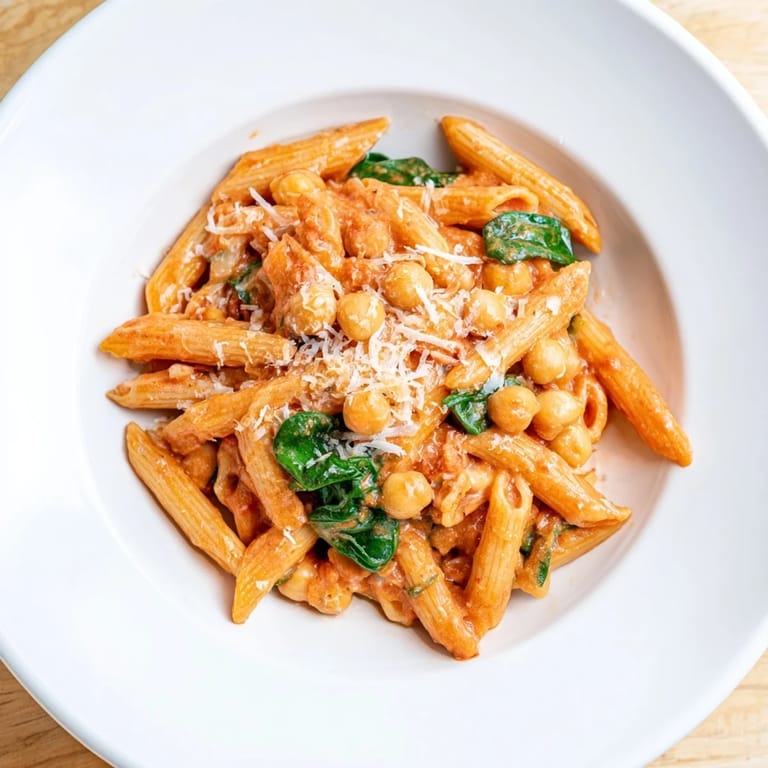 Save to Pinterest The smell of garlic hitting hot olive oil always pulls me into the kitchen, no matter what else I'm doing. This pasta happened on a Wednesday when I had half a bag of spinach wilting in the crisper and a can of chickpeas I kept meaning to use. I threw it all together with some cream and tomatoes, and it turned into one of those accidental wins that you immediately write down before you forget. Now it's the dish I make when I want something that feels indulgent but comes together in less time than it takes to stream two episodes of anything.