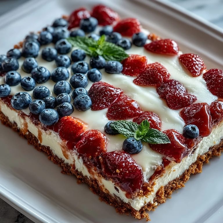 Save to Pinterest Celebrate Independence Day with a dessert as vibrant as the occasion—a festive no-bake cheesecake that beautifully mirrors the American flag. This creamy, luscious cake combines a buttery graham cracker crust with a smooth cheesecake filling, all topped with fresh strawberries, blueberries, and optional raspberries arranged in a patriotic design. It's an easy, crowd-pleasing treat perfect for summer gatherings and picnics.