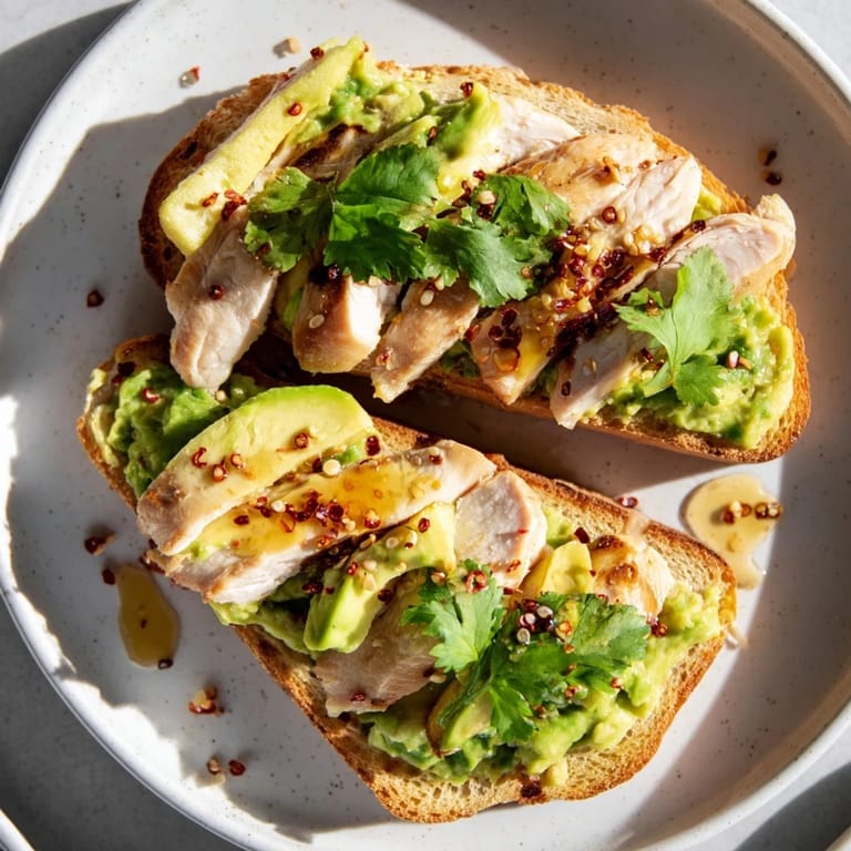 - Spread the smashed avocado generously over each slice of toast, then layer the sliced chicken on top. Sprinkle with chili flakes, drizzle honey over everything, and finish with fresh herbs if you like.